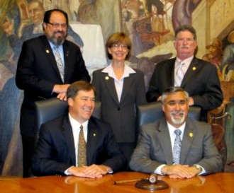 Photo: FLLewis/Media City G — (l-r) Newly elected Vice-Mayor and Mayor Dave Golonski and Jess Talamantes, joined fellow Council members Dr. David Gordon, Emily Gabel-Luddy, and Gary Bric for photos at the end of the council reorganization meeting at Burbank City Hall May 2, 2011